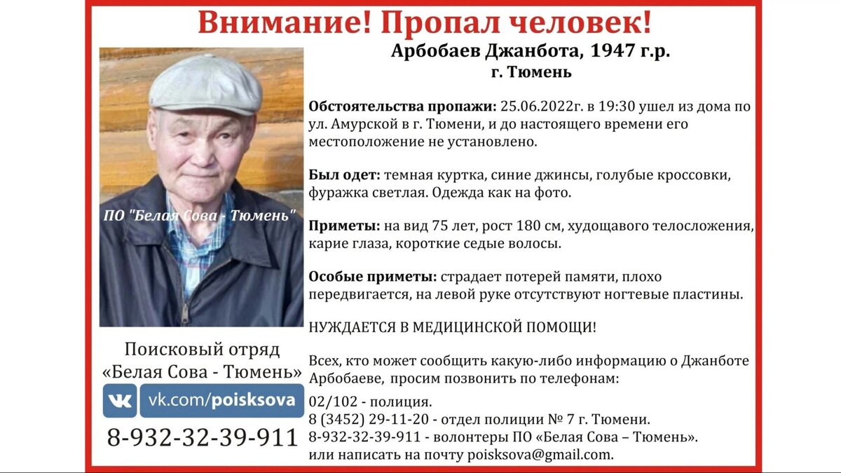 Мужчина ушел из дома 25 июня. В столице тюменского региона ищут 75-летнего Джанбота Арбобаева. Накануне пожилой мужчина вышел из дома на Амурской улице и пропал. В поисковой операции участвуют как сотрудники МВД, так и добровольцы. Организаторы поисков опубликовали приметы пропавшего: карий цвет глаз, седина, короткая стрижка и отсутствие ногтей на пальцах левой руки. Выходя из дома, он надел джинсы синего цвета, голубые спортивные туфли и светлую кепку. Арбобаев, как сообщается, испытывает проблемы с памятью и опорно-двигательным аппаратом. Ранее мы рассказывали о погибшем в тюменских болотах пенсионере, чье тело нашли с помощью беспилотника. Самые актуальные новости — в нашем Telegram-канале «Ямал-Медиа».
