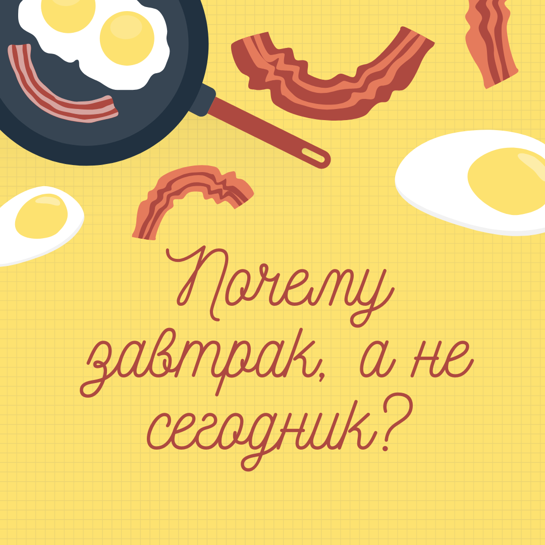 Почему первый прием пищи называют завтраком, если он происходит утром? Было бы логичнее сказать — утренник или сегодник. Если вы хотите поразмышлять над этим вопросом, остановитесь, не читайте дальше, подумайте, а потом проверите свою теорию. Дело в том, что слово «завтрак» восходит к слову «за утрок». Лингвистическая теория гласит, что это обозначает трапезу, которая следует за утром (после пробуждения) и представляет собой самый ранний прием пищи.