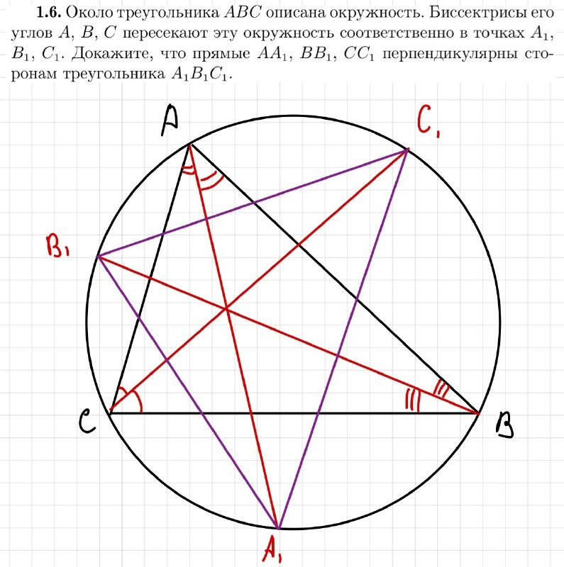 В таком случае мы можем обозначить дуги окружности, на которые опираются углы A1AB, B1BA и AA1C1 Далее возьмем некий угол (допустим A1MB) и по теореме о угле между хордами получим, что он равен полусумме дуг, которые заключены между ними и получим сумму α + β + γ, которая равняется 90 градусов