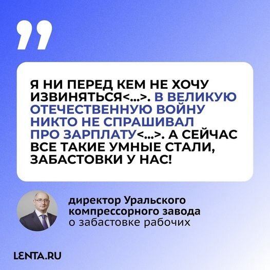 Странные объяснения директора Директор Уральского компрессорного затор Уральского компрессорного завода заявил , что проблемы с выплатой зарплат рабочим связаны с проводимой специальной военной операцией. По его словам, многие заказчики задолжали предприятию, в результате чего возникла задолженность по зарплатам. Директор призвал бастующих рабочих одуматься и отказался перед ними извиняться, сравнив текущее положение с периодом Великой Отечественной войны, когда, по его словам, никто не требовал зарплат.Между тем директор завода сильно ошибается, сравнивая сегодняшнее положение с Великой Отечественной войной. В то время зарплаты рабочим выплачивались установленные законом сроки. При этом сверхурочные работы оплачивались в полуторном размере (а сами сверхурочные работы не должны были превышать трех часов в сутки). Отпуска были отменены, при этом за них выплачивалась денежная компенсация. Сама по себе задержка зарплат вызвала бы соответствующую реакцию НКВД и прокуратуры. Что мы видим се