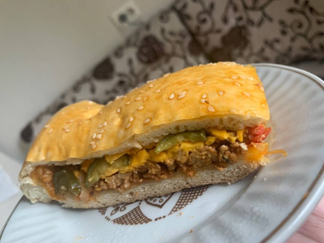 Ингредиенты: теста, кетчупа, дижонской горчицы, фарша, томатного пюре, луковица, сыра на сэндвичей, маринованных огурца, помидор, желток, кунжута, соль, перец, паприка, оливковое масло