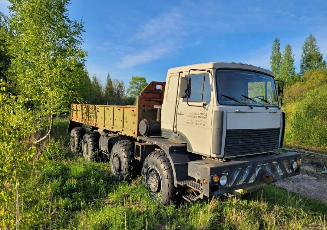 В Новгородской области на продажу выставили очень редкий грузовик. Продавец указал его как МАЗ, но совершенно очевидно, что перед нами продукция Минского Завода Колёсных Тягачей, или МЗКТ. Насколько я могу определить, судя по этим фотографиям, мы имеем дело с МЗКТ-7909. Это семейство восьмиколёсных полноприводных грузовиков было разработано в начале 90-х годов и появилось в продаже в 1992 году. Машины, предназначенные для работы в строительстве, добывающей промышленности, выпускались в нескольких вариантах: бортовой грузовик, плетевоз, седельный тягач, балластный тягач, шасси. В данном случае мы имеем дело с довольно экзотическим среди подобных транспортных средств бортовым грузовиком. Все модели семейства имели полную массу от 41 до 44 тонн и полный привод 8х8. Первоначально МЗКТ-7909 комплектовали дизелями Ярославского и Тутаевского моторного заводов, позднее покупателям начали предлагать варианты с моторами Cummins, Deutz и Caterpillar. Обычно в паре с двигателями шла механическая