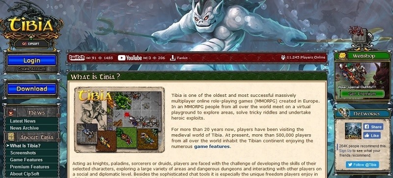 Tibia была так же популярна, как и ее современники, однако её популярность быстро угасла. В эту игру можно играть и сегодня, и она по-прежнему поддерживается первоначальными разработчиками, CipSoft. Задумайтесь - игру поддерживают с 1997 по нынешний 2022! Игра бесплатная, однако есть функция премиум-подписки, который расширяет функционал игры.