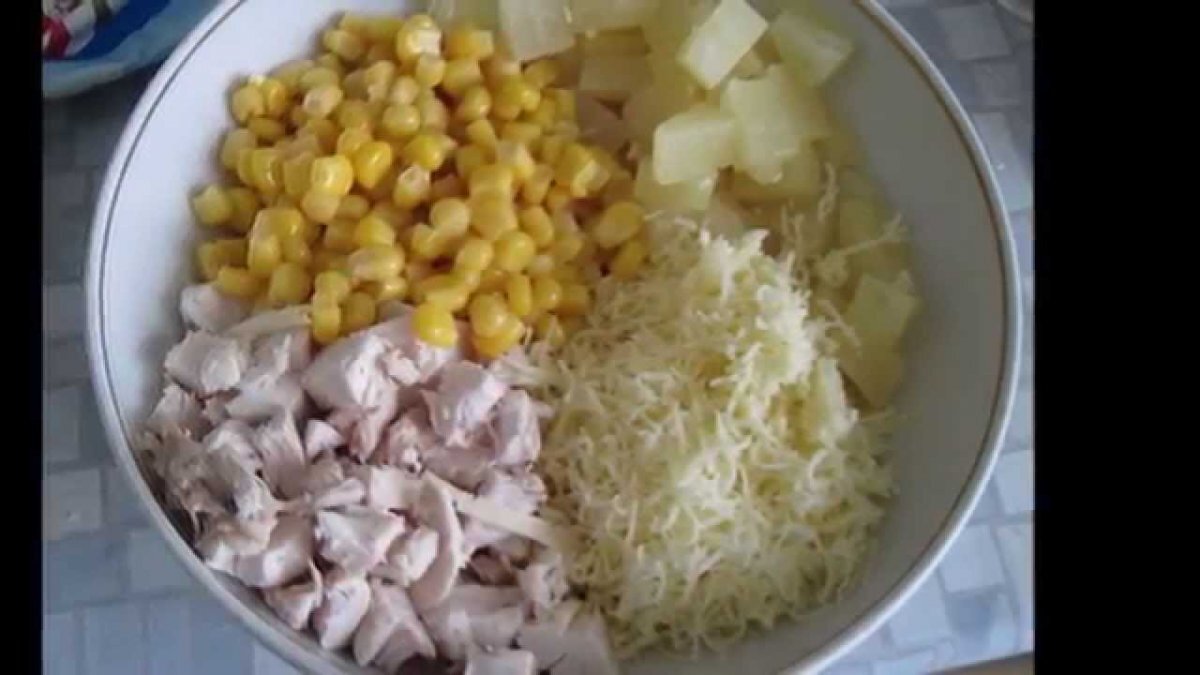 200 г отварного куриного филе, 120 г консервированных ананасов, 2 мандарина, 120 г сыра, 2 соленых огурца, зелень, майонез по вкусу