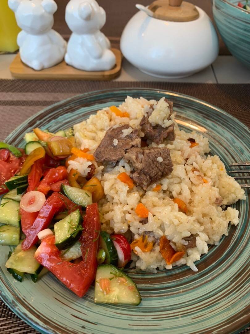 Конечно плов приготовленный на плите не сравнится с пловом в казане на огне, но всё же вкусно и сытно. Ингредиенты: риса для плова (идеально рис Басмати вкусный и рассыпчатый), моркови, лука репчатого, говядины, соль , специи для плова , вода, чеснок, растительное масло Способ приготовления: Рис промыть до прозрачности воды. Морковь и лук почистить. Морковь нарезать крупной соломкой, лук - полукольцами. Мясо порезать на средние кусочки и помыть. Разогреть масло (проверяю каплей воды, масло начинает «трещать», будьте аккуратней может масло попасть на кожу),положить в него мясо. Обжаривать примерно 10 минут на сильном огне, чтобы мясо схватилось корочкой и внутри будет сочным, после чего его убавить. Добавить к мясу лук и морковь, готовить вместе еще 5-7 минут. Насыпать специи, соль, (барбарис, куркума кто любит) налить воды, перемешать и довести смесь до кипения. Выложить рис, сверху воткнуть головку помытую, не очищенную, целую головку чеснока. По стенке казана долейте при необходимост