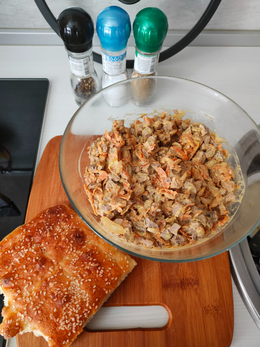 Всем привет! Начнем с простого, но очень перспективного салатика. Он не раз выручал меня. Хорош как в теплом, так и в холодном виде. Его можно использовать и как отдельное блюдо, т,к он очень сытный. Печень куриная 500гр. Морковь 2-3 шт. Лук репчатый 2-3 шт. Майонез Отвариваем печень и нарезаем кубиками, обжариваем нарезанный лук и натертую на крупной терке морковь на подсолнечном масле без запаха и среднем огне, так что бы сильно не поджарить, но довести до готовности. Все смешиваем, солим ,перчим, заправляем майонезом. Приятного аппетита!! Читайте также: Листья салата + огурец + яйцо = Витаминный салат.