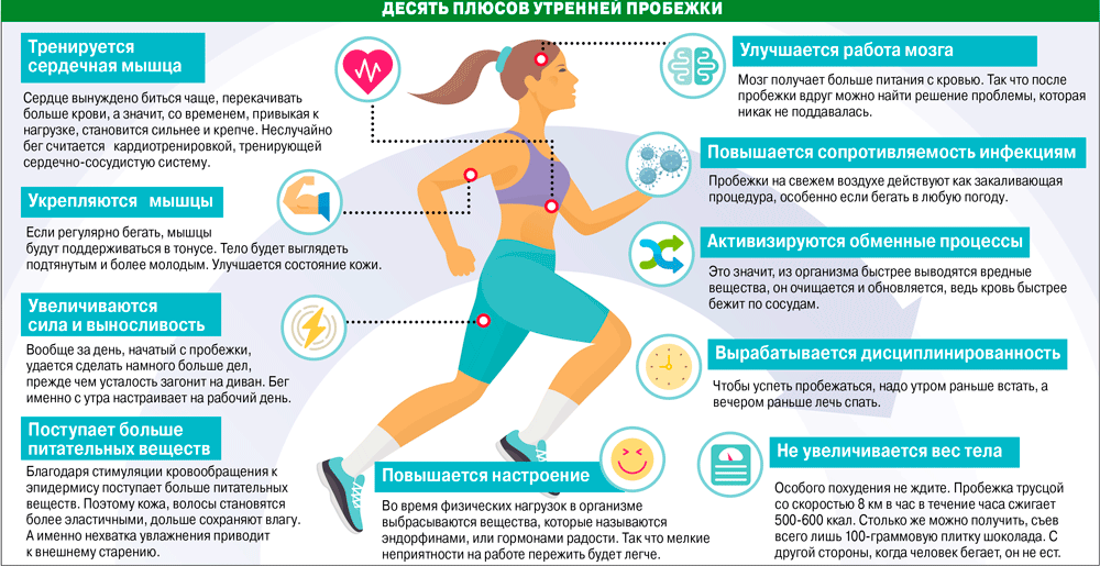 Ускоряется кровоток, сердечная мышца работает быстрее. Сосуды расширяются – риск инфаркта и инсульта при беге становится значительно меньше; Бег заряжает организм кислородом. Это дает выброс энергии. Бег — источник хорошего настроения. Этому способствуют эндорфины. Бег и работоспособность мозга — улучшается работоспособность мозга. Начинает активно работать метаболизм – расщеплять жиры и углеводы, выпуская энергию. Энергии хватает на весь день. Запускается обмен веществ – начиная с первого шага Вы будете тратить лишние калории; Фигура становится подтянутой. Вы получаете стройное, атлетическое тело. Сжигается много калорий. Человек становится выносливее. КАК НАДО БЕГАТЬ: 1 раз в неделю - минимум. Можно бегать 2 раза в неделю. Разминка.