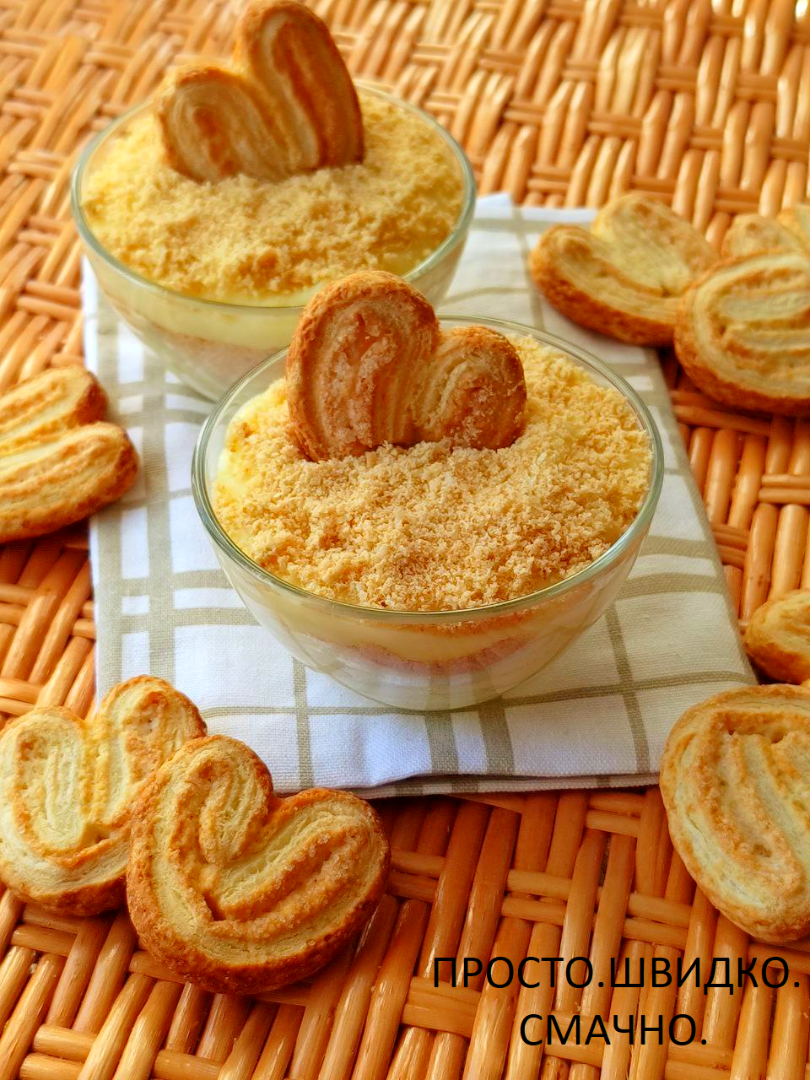 У спеку десерти без випічки - наше все) У кремі мало цукру, якщо любите більш солодке, адаптуйте під свій смак. Я не люблю приторно солодке, мені якраз) І так, десерт десертом, але бажання поласувати справжнім "Наполеоном" нікуди не ділося. Доведеться пекти) Ингредиенты: печива "Вушка", яйця, цукру, крохмаль кукурудзяний , молоко, вершкове масло, ванільний цукор Способ приготовления: У ємність викласти яйця, цукор, крохмаль. Збити міксером до однорідної маси. Молоко поставити нагріватися. Тоненькою цівкою, помішуючи, влити яєчну суміш. Нагріти, помішуючи, до кипіння та виключити. В крем додати масло та ваніль, перемішати. Я поставила крем в холодильник вистигати. Печиво подрібнити в крихту. Краще блендером та порціями. В креманки викладаємо ложку крему. Зверху ложку крихт. Чергуємо шари до закінчення продуктів та вільного місця у креманках)) Лишаємо десерт при кімнатній температурі, потім ставимо в холодильник на кілька годин. Я готувала з вечора до ранкової кави. Смачного!