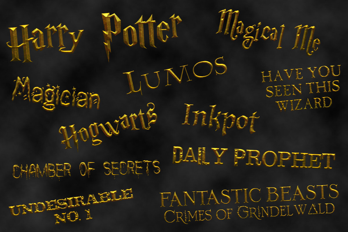 Волшебный мир изобилует типографским разнообразием. Давайте поближе рассмотрим шрифты, использованные в фильмах, а также вдохновлённые ими. Также, в конце Вы найдёте ссылку на скачивание всех этих шрифтов. Harry P Harry P — это самый ранний и самый популярный шрифт, который использовался для создания логотипа фильмов о Гарри Поттере. Он вдохновлён оригинальной обложкой американского издания Гарри Поттера с использованием иллюстраций Мэри Грандпре. Lumos Lumos — это шрифт, вдохновлённый названиями глав американских изданий книг о Гарри Поттере. Он также включает в себя ряд символов из Гарри Поттера, в том числе метлу и Золотой снитч. Magical Me Magical Me (также известный как Parry Hotter) — это шрифт, вдохновлённый нашим любимым магическим мошенником Златопустом Локонсом и его автобиографией "Я - волшебник". Fantastic Beasts Этот шрифт вдохновлён логотипом серии приквелов «Фантастические твари». Crimes of Grindelwald Crimes of Grindelwald — шрифт, вдохновлённый логотипом, созданным