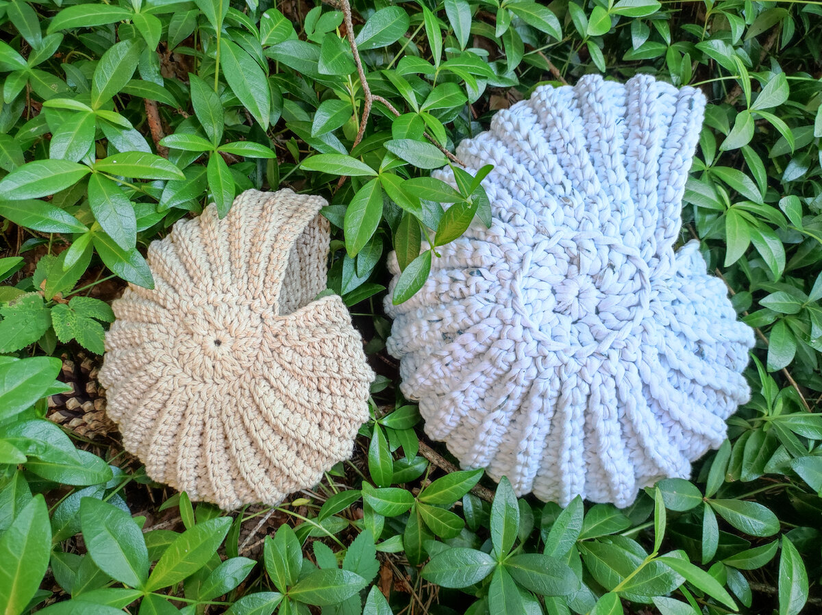 Всем привет! Очень мне нравятся эти ракушки! Давно хотела связать. Вязала по видео мастер-классу. Такой формат подачи материала мне не по душе, я предпочитаю тексты и графические инструкции. Специально для таких, как я, сделала описание и нарисовала схемы. Приступим! Основа ракушки- два круглых элемента. Один круг связала и обрезала нить. Второй круг закончила и провязала 13 воздушных петель. Ориентироваться лучше по парам рядов. Каждый чëтный ряд это столбики без накида в каждое основание. Все без исключения ряды вяжутся за заднюю дужку основания. Важно! Первая и последняя петля каждого ряда- соединительная! Далее вязание разбито на блоки. Первый блок. Блок состоит из четырёх пар рядов. Как видите, тут есть прибавки, соответственно ряды отличаются друг от друга. Второй блок самый лëгкий. Схема дана одной пары, которая повторяется 12 раз. Третий блок опять пройдëт с прибавками. Третью пару третьего блока повторяю 3 раза. Я связала ракушку из двух видов пряжи. Вариант из в