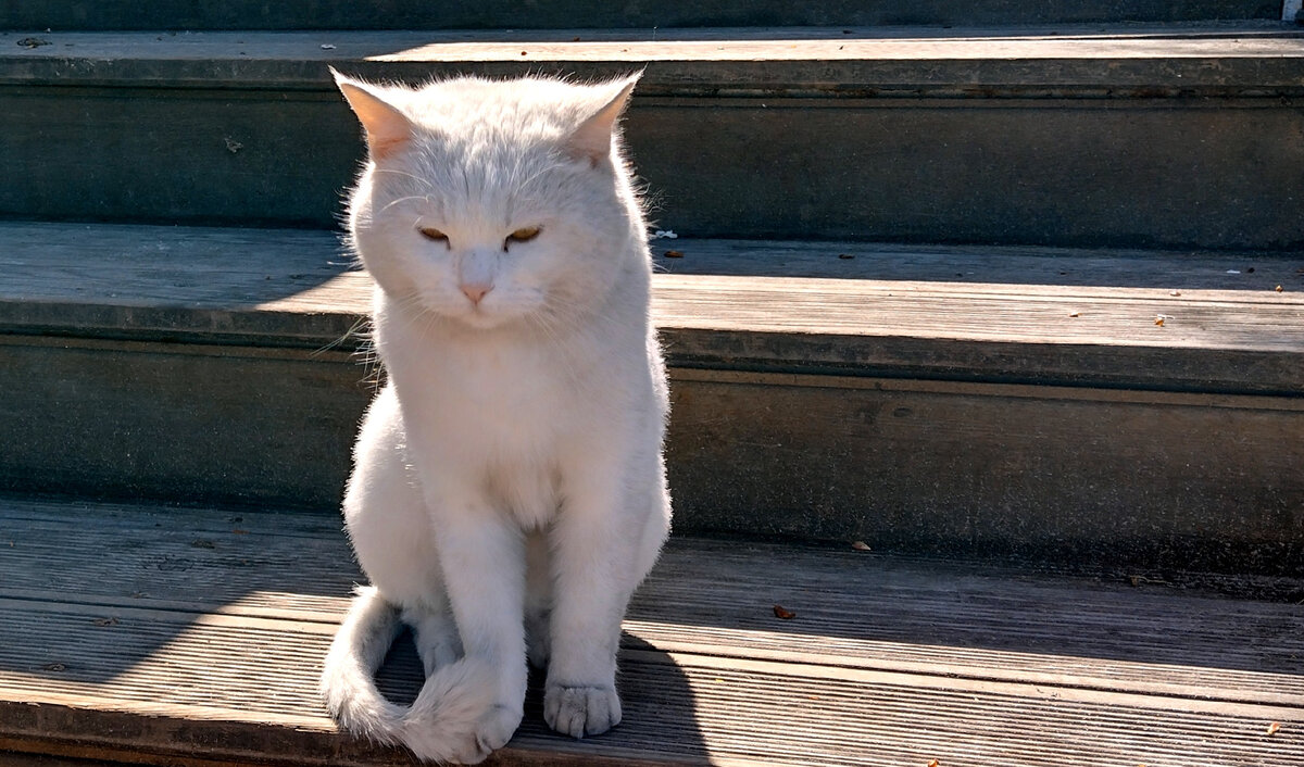 С этим очаровательным котиком я повстречалась в городе, который по праву завоевал славу кошачьей столицы. Называется он Зеленоградск и находится в Калининградской области на берегу Балтийского моря. Прямо на набережной есть кафе, возле которого и живет этот белый красавец-кот. У него имеется собственный домик, можно сказать почти особняк. На главной улице Зеленоградска для кошек построены многоквартирные домики, но из-за большого скопления животных, жить в них не так комфортно. Чудесная панорама открывается вокруг незатейливого жилища кота. Живописный вид на Балтийское море и причудливая архитектура города в европейском стиле создают неповторимый колорит. Белый котик приветливо встречает посетителей кафе «Папаша Беппе». Он выходит из своего домика и садится на лестнице. Туристы и отдыхающие города спешат сделать фото кота, а он привык к такому вниманию и охотно позирует. Кисточка на хвосте придаёт ему особый шарм и интеллигентность. Не только дети, но и любопытные взрослые норовят за