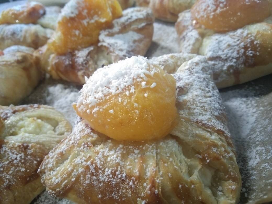 Ингредиенты: дрожжевого слоеного теста, творога 9%, сахара, абрикоса, яйцо, муки Способ приготовления: Стол присыпаем мукой, выкладываем тесто и делим тесто на 4 части. Из 2 х листов теста у меня получилось 8 квадратиков. В творог положить сахар и размешать до однородности. Выкладываем начинку в равных долях, на все слойки. Защипываем края, в середину сверху выкладываем половинку абрикоса на каждую слойку. Смазываем слойки яйцом, выпекать в разогретой духовке при температуре 200 гр 12-15 мин.