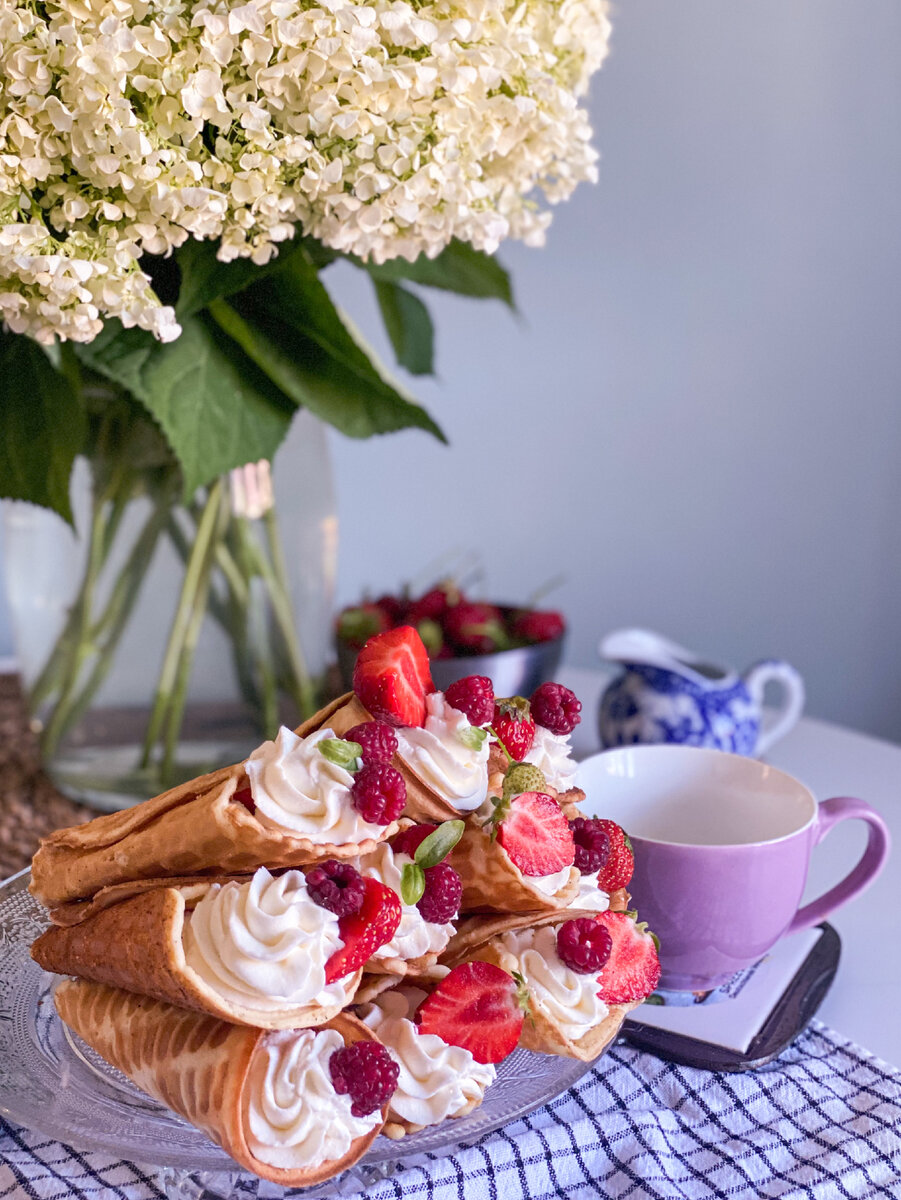Это настоящий, летний десерт! Когда изобилие ягод «бьёт ключом» из каждого дачного участка, вы найдёте им применение, приготовив этот не сложный, но очень вкусный и эффектный десерт! В основе его лежат те самые вафли времён СССР . Помните их? Предлагаю осовременить классические трубочки со сгущёнкой и попробовать что-то новенькое. 😉 ВАФЛИ: Яйца-5 шт Сахар - 180 гр Мука - 200 гр Масло сливочное - 200 гр Разрыхлитель -1 ч.л. Соль-1/2 ч.л. Ванильный сахар - 1 пакетик КРЕМ: Сыр творожный - 400 гр Сливки 33%-300 гр Сахарная пудра - 5 ст.л. ПРИГОТОВЛЕНИЕ: 2.Затем растопите сливочное масло , не доводя его до кипения, и влейте в ёмкость , слегка помешивая яичную массу. Важно , чтобы масло было не сильно горячим , иначе яйца могут свернуться . 3.В последнюю очередь добавьте муку. Консистенция должна быть похожа на густую сметану . Борозды от венчика не должны быстро пропадать . 4.Разогреваем вафельницу . У меня она вот така.) У вас может быть электрическая . Если у вас такая же как у мен