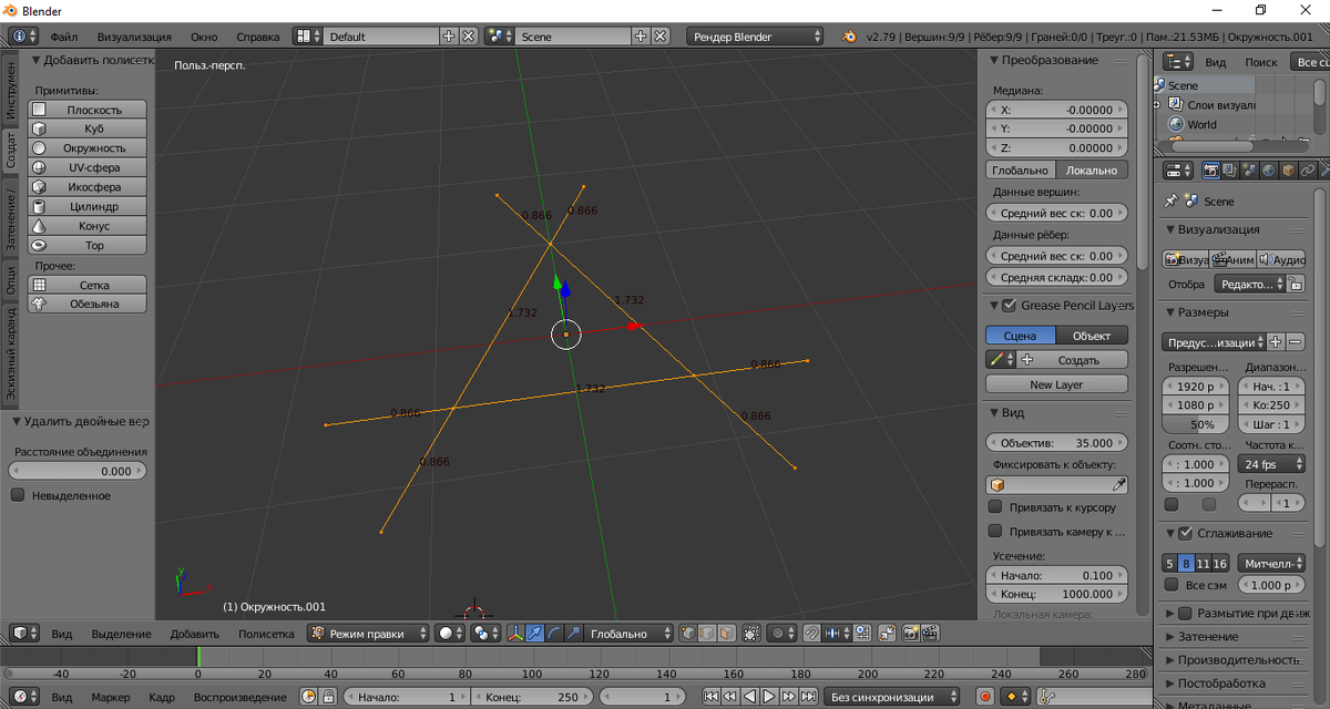 Итак в предыдущих статьях мы научились строить многогранники Рёло любой размерности, а также искажать эти многогранники не теряя вершины. В самом начале я показал "быстрый" моноширинный многогранник, который потерял одну вершину(быстрый потому что построения самые простые, ничего не считать, построил и все). Сегодня посмотрим как убрать все вершины у тетраэдра Рёло. Сам тетраэдр мы пожалуй строить не будем. Представим итоговое тело как сумму поверхностей прокручивания моноширинной фигуры на угол. Построим правильный треугольник, и удлиним его стороны в два раза: Ну думаю понятно, стороны треугольника остались те же, просто добавились отрезки к каждой стороне лежащие на тех же прямых что и стороны треугольника. Можно и не вдвое, здесь кому как нравится, мне понравилось так. Строим моноширинную фигуру на базе этих трех центров вращения. Для тех кто изучал моноширинные фигуры по популярным изданиям это действие может показаться удивительным. Поясню: плоская моноширинная фигура это некото