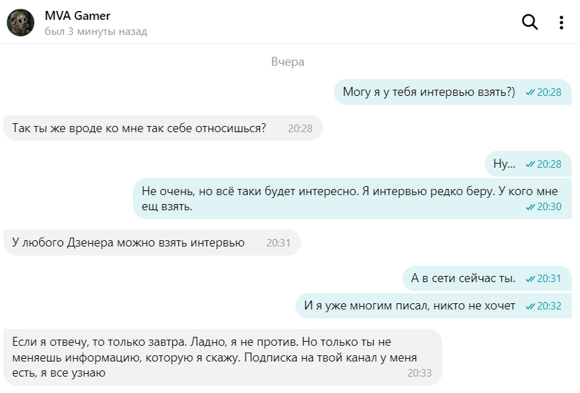 Всем привет! Наверное все знают что у меня с MVA возникли ссоры. Но короче: Короче информацию я не меняю, и мы продолжаем. 1. Планируешь менять ситуацию с Аспиком? Не знаю. После всего того, что он наделал и его грубости по отношению ко мне, не уверен, что что-то поменяю 2. Как давно играешь в Minecraft? Играю около 7 лет, точно уже не вспомню 3. Какая твоя любимая игра кроме Minecraft? Я люблю серию игр S.T.A.L.K.E.R, иногда играю в CS: GO, Standoff 2, PUBG. Так у меня еще много игр на компе, но в большую часть не играю 4. Каких блогеров смотришь или читаешь? Всех не перечислю, ибо в Дзене у меня более 100 подписок, на Ютубе подписан на 107 каналов. В основном смотрю или читаю то, что попадётся в ленте. Могу выделить сюда канала MrBK, Кубическая Лама, Serjant Egor, Блог Эльфийки, Doctor K. 5. Почему решил создать канал на Ютубе? Мне он нужен был чисто для Дзена по началу, да и веду его я не на постоянной основе, а просто как увлечение. 6. Зачем ты решил заводить канал? Сначала уточню