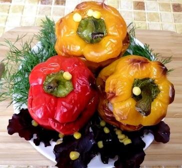 Всем доброго времени суток! Сегодня в меню фаршированные перцы. У нас были: Фаршированные помидоры Фаршированные шампиньоны Начинка будет не совсем традиционная. К фаршу и рису мы добавим консервированную кукурузу. Да, да... И пусть Вас это не смущает. Нам понадобится (на 3 перца). Перец болгарский ( лучше разных цветов) - 3 штуки. Фарш - 100 - 120 грамм Лук - 1 штука Рис - 70 грамм Кукуруза - 70 грамм Соль, перец по вкусу. Растительное масло- 3 ст.л. + сколько потребуется для жарки лука. Приступим. 1. Рис промыть, отварить, остудить. 2. Лук нарезать и обжарить до легкого колера на растительном масле. Остудить. 3. В миске смешать: Фарш, лук, рис, кукурузу, соль, перец по вкусу. 4. Подготовить перцы: помыть, срезать верхушки ( но не выбрасывать), удалить семена и перегородки. 5. Наполнить перцы подготовленной начинкой из фарша. 6. Поставить перцы в форму для запекания, накрыть перцовыми крышечками, налить сверху на каждый перец по 1 ст.л. растительного масла. И ставим в духовку разо