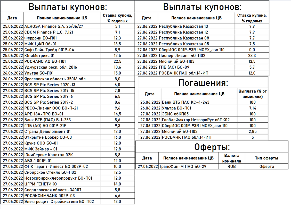 Выплаты, оферты и погашения облигаций на текущей неделе: сегодня 27.06.2022 года.