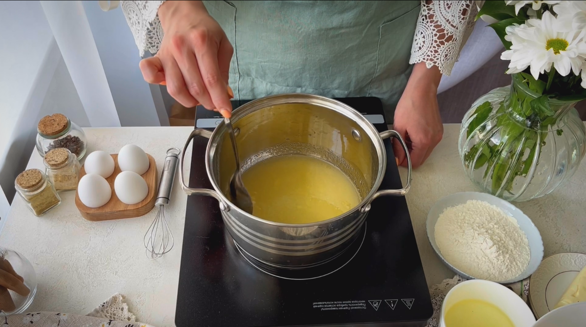 Важно! Сироп обязательно нужно охладить. При добавлении муки в горячий сироп, заварка получится твердой, что затруднит процесс размешивания. Но если сироп остудить до более низкой температуры ухудшит вкус конечного продукта.