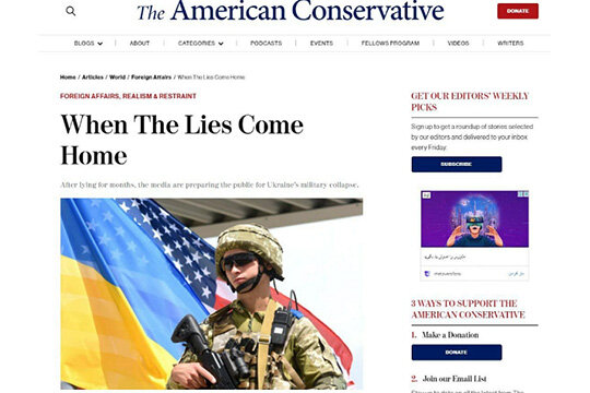 Обложка статьи на сайте журнала «The American onservative» о ситуации на Украине: «Когда Ложь возвращается домой»