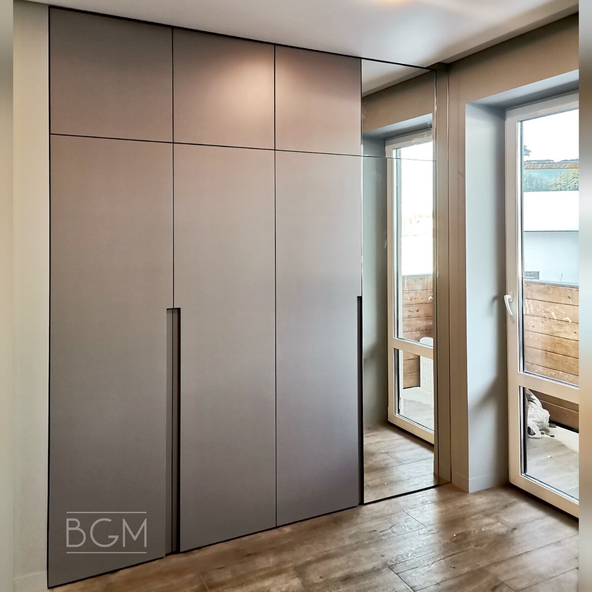 Размеры (ВхШхГ): 2593х2317х1020мм; Фасады: эмаль матовая NCS S 4502-R, двухсторонняя покраска; Корпус: Egger H3330, Дуб Антор натуральный; Фурнитура: петли Blum, направляющие ящиков с доводом; Стоимость "под ключ" с замером, доставкой и установкой на момент заказа - 215 000 руб.; Для расчета стоимости присылайте информацию в WhatsApp, Телеграм или VK - bg-mebel.clck.bar.