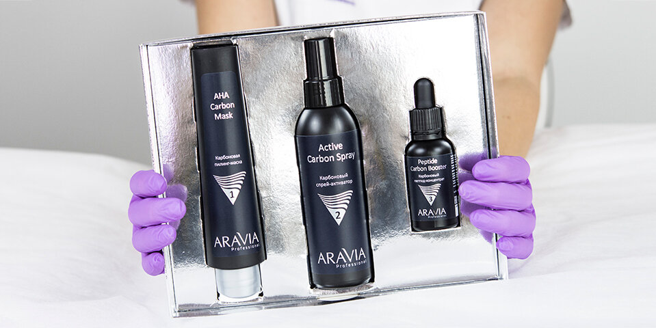 Сегодня расскажем вам, как и для чего делать клиентам карбоновый пилинг, какие средства потребуются для правильного выполнения процедуры. Карбоновый пилинг-комплекс ARAVIA Professional– это прекрасная альтернатива инъекционным процедурам. Результат будет заметен уже после первой процедуры. Максимальный эффект клиент увидит после полного курса – 10 процедур раз в неделю. Показания к применению Какой эффект ожидать после курса процедур Противопоказания Делаем карбоновый пилинг правильно Подготовка кожи Гель для умывания с активированным углем Detox Carbon Cleanser. Небольшое количество средства сэмульгируйте, нанесите на влажную кожу, вспеньте, а затем смойте водой. Шаг 1 Карбоновая пилинг-маска AHA CARBONIC MASK с фруктовыми кислотами, шунгитом и углем. С помощью кисти нанесите маску на подсушенную кожу. Оставьте на 7 минут. Не смывайте. Шаг 2 Карбоновый спрей-активатор ACTIVE CARBONIC SPRAY с аминокислотами и гидроксиэтил мочевиной. По окончании экспозиции маски распылите средство пове