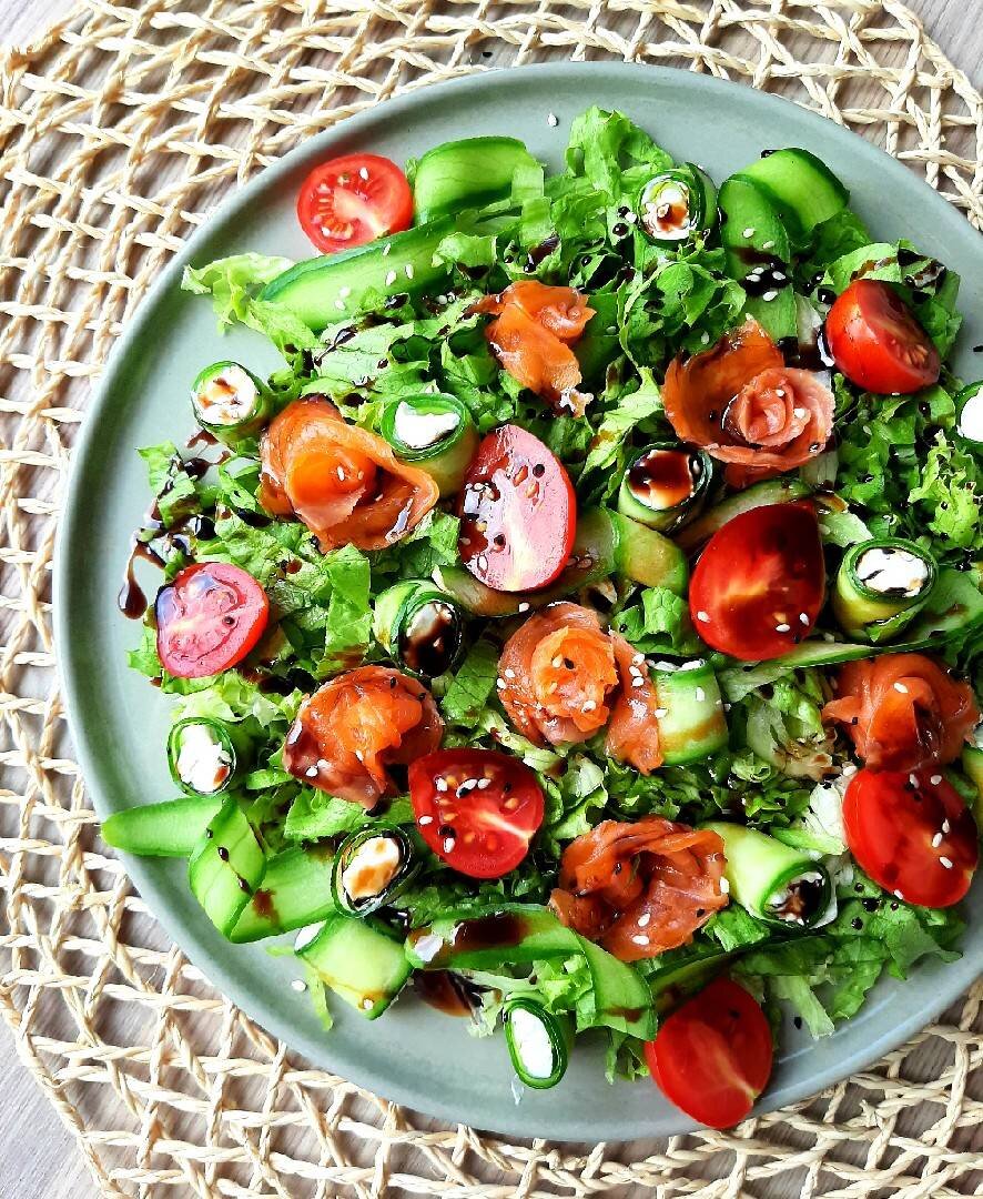 Очень яркий и безумно вкусный салат украсит любой праздничный стол Ингредиенты: Любимая зелень (у меня латук), Огурцы, Соленая красная рыбка, Помидорки черри, Сливочный сыр, Бальзамическая глазурь, Белый и черный кунжут (опционально) Способ приготовления: Листовой салат нарезаем и кладём на сервировочное блюдо. Огурцы нарезаем на тонкие слайсы с помощью овощечистки и промакиваем бумажным полотенцем. На один край кладём пол чайной ложки сливочного сыра и сворачиваем в рулетик. Из красной рыбки можно сделать розочки, свернув тонкий слайс в рулетик и немножко развернув края, либо же можно просто порезать небольшими кусочками. Выкладываем на листовой салат рулетики из огурца и сливочного сыра и красную рыбку. Также сверху кладём несколько разрезанных напополам помидорок черри. По желанию посыпаем салат кунжутом, чёрным и белым. Перед подачей поливаем бальзамической глазурью. Приятного аппетита 😊