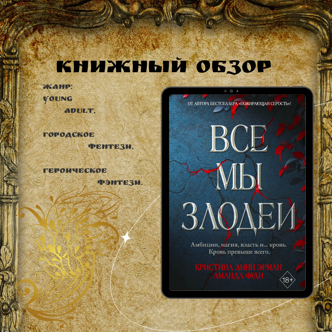 "Мы все злодеи" Автор: Кристина Линн Эрман, Аманда Фуди Объём: 430 стр. Книга оставила противоречивое послевкусие. Хоть задумка магических Голодных игр мне импонирует. Тут есть, где развернуться. Если бы множество идей не было так ярко скопировано. А с концовкой в этой книге так вообще беда! Это двустворчатые двери в полтора человеческих роста открытые настеж. Дальше-то что? Только вроде сформировались альянсы, все определились с точками зрения. И все. Клякса вам вместо концовки. Сюжет Семеро представителей влиятельных семей должны участвовать в турнире и убивать друг друга, пока не останется один. Ладно, допустим. Выигрывший, обеспечивает своей семье доступ к особой магии. Тоже предположим. Оружием здесь выступают проклятья и Реликвии, а также есть Достопримечательности, некие стратегические точки на территории турнира. Вот. Это уже интереснее. И каждый герой также ищет себе покровителя. Фи, где-то я это уже видела. И реликвии-то с неба падают. Нет бы квест какой придумать, напр