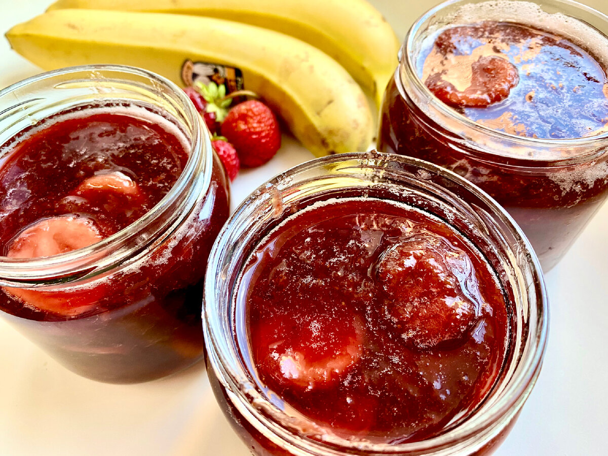 Очень ароматное варенье с целыми неразваренными ягодами клубники и бананом, по вкусу напоминающим вяленый 🍓🍌 На 1,4 л варенья понадобится Клубнику очищаем, засыпаем сахаром и оставляем на 2 часа. Затем ставим на огонь и доводим до кипения. Варим 10 мин на слабом огне. Если есть пенка, снимаем. Даем остыть. Бананы нарезаем кружочками. Клубнику в сиропе доводим до кипения, добавляем бананы и варим 10 мин на слабом огне. Даем остыть. Процесс варки повторяем еще один раз. Банки стерилизуем. Я делаю так: кастрюля с кипящей водой, на ней дуршлаг, сверху банка. Даем остыть варенью, затем раскладываем его по чистым сухим банкам. Приятного аппетита 😊 Смотрите в профиле другие рецепты консервации 🍓