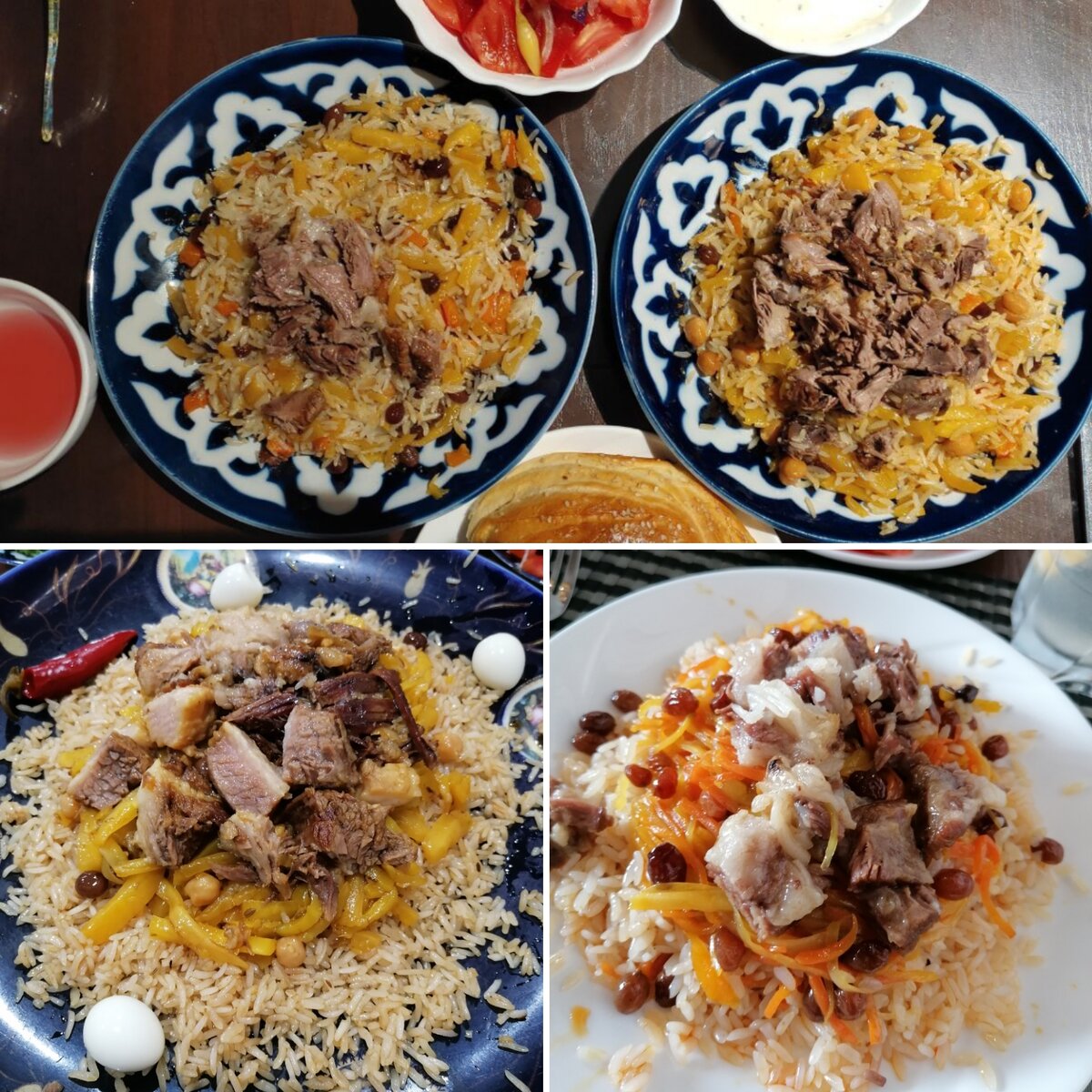 Нам перепал плов ташкентский праздничный и суперпраздничный. Праздничный готовят на подсолнечном масле с говядиной, суперпраздничный на оливковом масле с говядиной и бараниной. И тот, и другой выше всяких похвал. В ташкентский плов добавляют изюм, нут и красную морковку. К плову надо брать айчичук (салат из помидоров с белым луком), айран (типа нашего кефира, но пожиже) или сузьму (типа нашей сметаны). И зелёный чай. К чаю подарят сахар, халву, финики и черный кишмиш (с веточками).