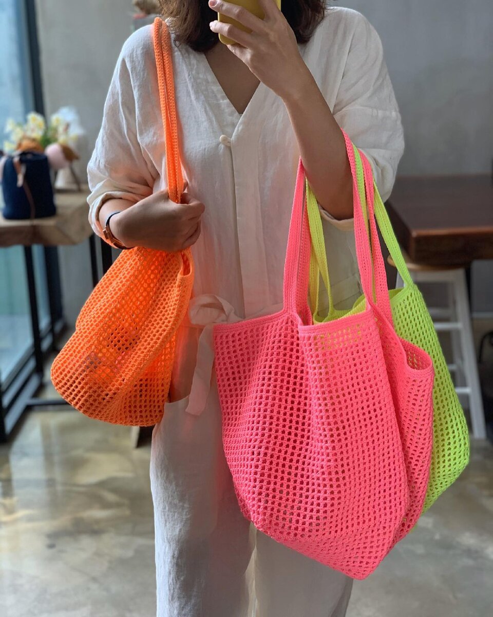 Ну конечно с большой и яркой😊😊😊 САМАЯ модная и популярная модель этого сезона: шоппер-авоська. Вяжется она из полиэфирного или хлопкового шнура диаметром 2 мм. Ну и конечно ловите схему. Сначала вяжется дно, потом переходим к стенкам сумки, заканчивается вязание ручками. А если ваша сумка будет безумно яркая, как на этих фото, вы точно будете в центре внимания всех модниц😊😊