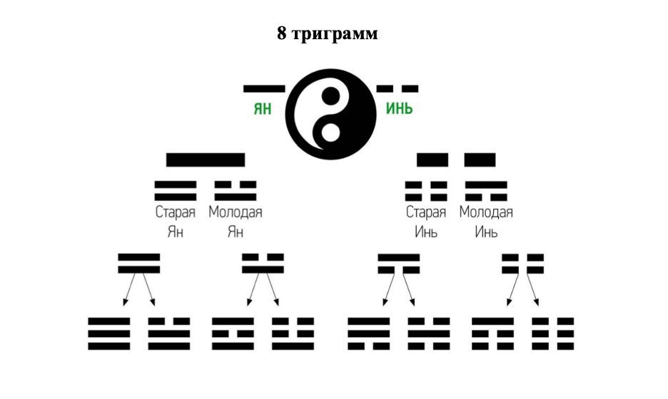 Даосы передавали энергию (все начинается с энергии Ци) в виде чёрточек. Мы пишем звуки буквами, точно также даосы начали рисовать энергию чёрточками. Как вы помните энергия делится на Инь и Ян, так вот, энергию Ян даосы чертили сплошной линией, а энергию Инь - прерывистой линией, т.е. линия и пробел. И энергия Инь и энергия Ян делится на старую (долго существует) и молодую (только-только зародилась). В смешении энергий – Инь и Ян, Старой Инь и Старой Ян, Старая Инь и Молодой Инь, получилось 8 триграмм: Слово «Триграмма» означает о том, что есть три чёрточки: - Верхняя линия отвечает за невесту задачу, которую спускается с неба, - Нижняя линия отвечает за земную удачу - энергия, которая поднимается из недр земли, - Средняя линия - человеческая удача, человек тоже находится между небом и землей. Триграммы отображают полностью это взаимодействие. Каждая триграмма отвечает за члена семьи, сектор в квартире, возраст человека, а также у каждой триграммы есть свой первоэлемент/стихия (существ