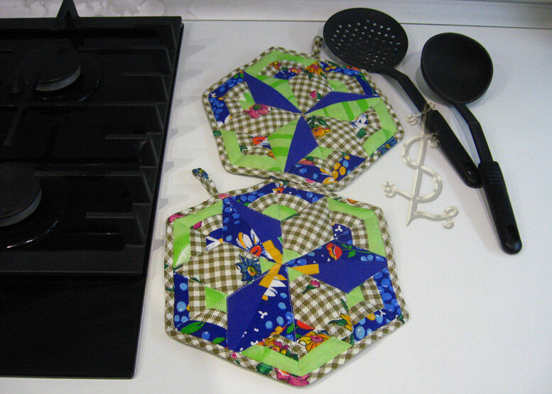 Все мы дарим подарки. И хочется, чтобы подарок радовал одаряемого. Я нашла для себя такой подарок. Мне, иногда приносят сшить постельное бельё, от него остаются остатки хлопчатобумажной ткани, и чаще всего их не забирают. У меня их накопилось достаточно. Изначально, когда ткани было много, я шила цельнокроеные прихватки в виде сердца. Но крупные лоскуты быстро закончились, и я перешла на пэчворк. Первоначально собирала только полоски и прихватки получались квадратными или прямоугольными. Пэчворк меня захватил, решила разнообразить, и перешла на шестигранные прихватки. И они мне так пришлись по сердцу, наверно, потому что подобны пчелиным сотам, а с точки зрения антропоморфизма я себя ассоциирую с пчелкой. А с кем Вы себя ассоциируете из мира фауны? И потом, используя в этих прихватках полоски из идентичной ткани, получаются самые разнообразные узоры. И для них можно использовать самые мелкие лоскутки. Для пошива прихваток я докупаю только синтепон, соответственно они получаются очень