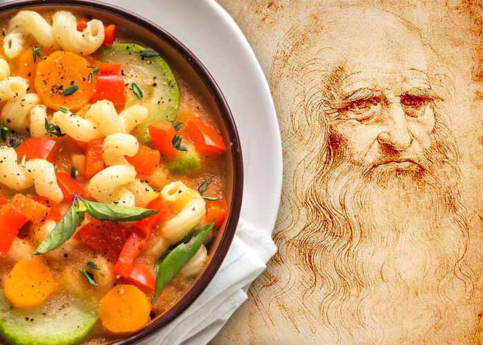 «Если хочешь остаться здоровым, то уделяй внимание следующим правилам: никогда не ешь без аппетита и ешь только то, что легко усваивается. То, что ты глотаешь, тщательно обслюнявливай, а пищу готовь хорошо и неприхотливо. За столом сиди прямо и после еды не ложись спать. С вином обходись заботливо и никогда не вставай из-за стола с пустым желудком». Эти весьма актуальные правила были написаны более 500 лет назад. Их автор, пожалуй, самая мистическая личность всех времен и народов — Леонардо да Винчи. Живописец, скульптор, архитектор, инженер, ученый, музыкант и этот список можно продолжать еще долго. Он экспериментировал с кулинарными рецептами, создавал кухонные гаджеты, организовывал банкеты и разрабатывал рекомендации по кухонной эргономике. Ко всему прочему, по этическим соображениям, он был заядлым вегетарианцем. Механическое устройство для колки кедровых орехов, ручной пресс для чеснока, машинка, разрезавшая тесто на узкие полоски (прообраз спагетти) и многие другие изобретения п