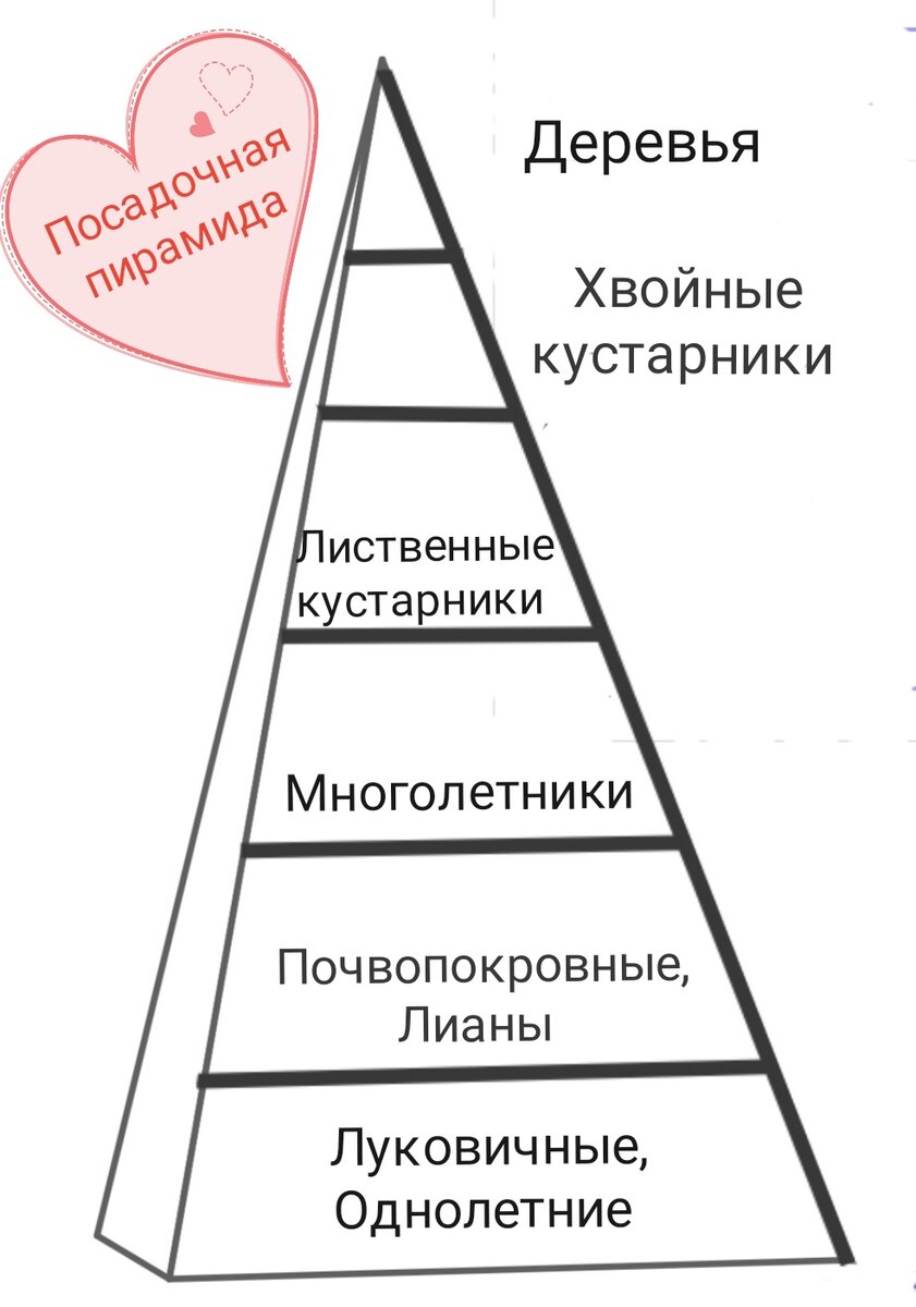 Глядя на эту посадочную пирамиду, легко понять многослойность ландшафта. С ней можно легко создавать объёмные миксбордеры. Эта пирамида поможет вам понять, какого типа растения и сколько растений каждого типа нужно сажать в своем саду. По мере того как мы продвигаемся вниз по садовой пирамиде от узкой вершины к широкому основанию, количество каждого вида растений увеличивается. Начните с вершины посадочной пирамиды и продвигайтесь вниз. Остановимся на каждом слое садовой пирамиды Слой 1: декоративные деревья. В каждом саду, независимо от того, насколько он большой или маленький, нужно хотя бы одно декоративное дерево. Чтобы придать вашему саду структуру. Слой 2: вечнозеленые хвойные кустарники Вечнозеленые хвойные кустарники объединяют посадки в саду в гармоничный ландшафт. Слой 3: лиственные кустарники Лиственные кустарники добавляют баланс вашему ландшафт. Выглядят разнообразно в разные сезоны. И имеют длительные периоды цветения. Слой 4: Многолетние растения и цветы С к