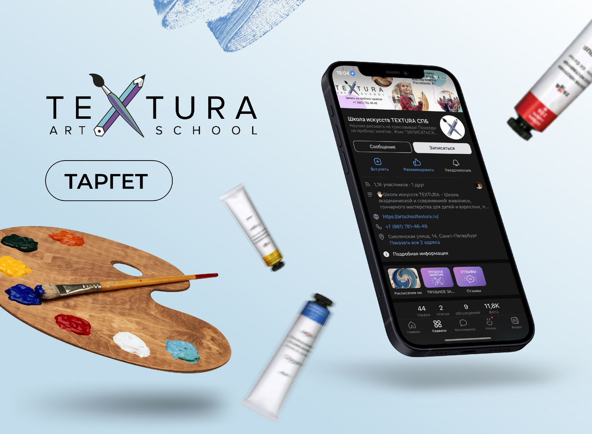 О проекте Художественная студия TEXTURA - это школа академической и современной живописи, гончарного мастерства для детей и взрослых. Здесь преподают важнейшие основы изобразительного искусства: рассказывают об отношениях формы и пространства, работе с цветом, правилах композиции, учат работать с разными материалами. Среди множества направлений обучения — живопись маслом, акрилом и акварелью, основы рисунка, изображение фигуры, скульптурная лепка, эпоксидная смола и многое другое! Задачи проекта Работа в данном проекте велась только с таргетированной рекламой. Заказчик обратился к нам уже с оформленными социальными сетями и вел группу Вконтакте самостоятельно. Нашей ключевой задачей стала настройка таргетированной рекламы для художественной студии. Ход работы В начале мы проанализировали всех конкурентов в радиусе 20 км, посмотрели оформление их групп, рекламные креативы и офферы, данную информацию мы учли при подготовке собственных креативов и настройке рекламы.