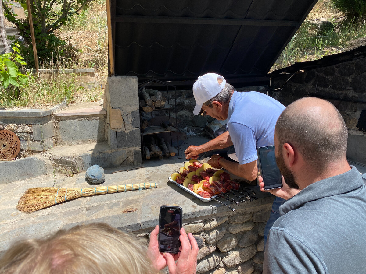 День X, конечно, запомнится навсегда, он был особенным в турне по Армении. Главным образом, люди и природа — это главное достояние (сокровище). ❤💯🤝✌ Дядя Володя это дядя нашего гида, он живёт в частном доме и у него свои виноградники, а в гараже целая винодельня. Есть всё, что нужно для счастливой жизни: зона барбекю, винодельня, огород, животные и любящая семья. Дядя Володе 70 с небольшим, он бодр и весел. Очень душевный человек, встретил нас, как родных. Провёл экскурсию по своей территории. Самое классное, что это не туристическое место, сюда не водят толпы людей каждый день. Шашлык в тандыре 🥩🍆 Дядя Володя провёл нам мастер-класс по приготовлению шашлыка с овощами в тандыре. На самом деле рецепт максимально прост — это свежее мясо, перец, соль, овощи и душа. В тандыр и запекаем. 🔥 Нам накрыли шикарный стол, где было абсолютно всё. Про разговоры и тосты я молчу, всё было очень душевно и незабываемо. Напиток Богов🍇🍷 Но самое главное, дядя Володя отвёл нас в своё самое сокровен