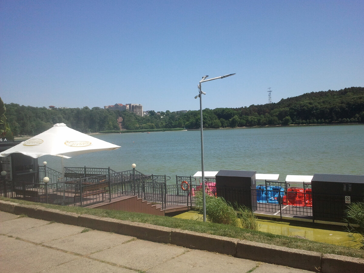Почему-то, не сфотографировала машины, интересно было бы самой дома посмотреть. А это немного другой ракурс на озеро со стороны водных велосипедов. Гранитная лестница, с которой начали путешествие - чуть левее зданий вдали.
