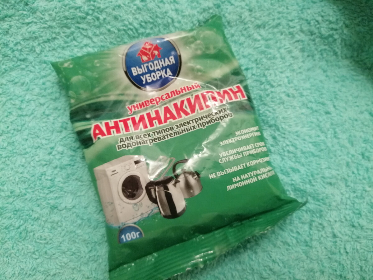 - Конечно, полотенце перед стиркой замачиваем. Для этого готовлю раствор из воды и одного единственного компонента – «Антинакипина» для стиральных машин и чайников. Купила самый дешевый, какой нашла в магазине – за 29 рублей.