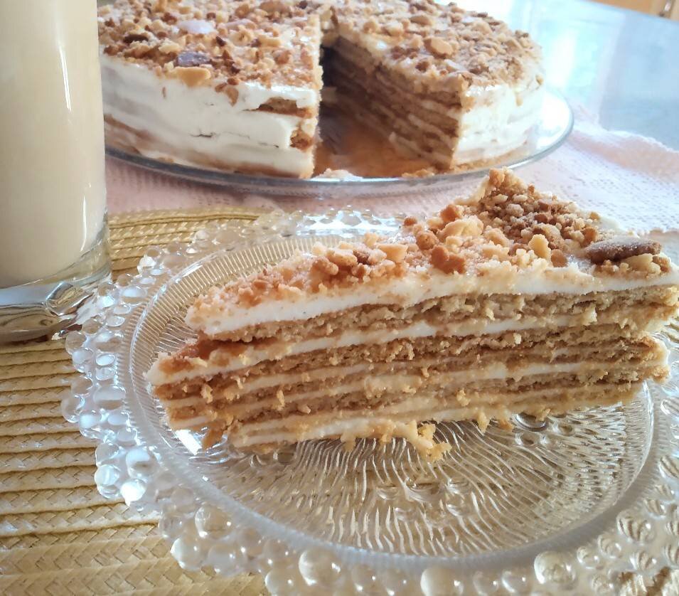 Один из рецептов медового торта. Ингредиенты: мёда, сливочного масла или маргарина, яйца, сахара, соды погашенной уксусом, муки, Крем:, сметаны, сахара Способ приготовления: В кастрюлю помещаем мёд, масло и сахар и на среднем огне доводим до полного растворения сахара. Яйца слегка взбиваем ручным венчиком. Убавляем огонь до минимума и добавляем яичную смесь. Продолжаем прогревать постоянно помешивая минуты 3 - 5. Убираем кастрюлю с огня и постепенно добавляя муку замешиваем тесто. Не забудем добавить соду погашенную уксусом. Оставляем тесто в покое на 20 минут. Тесто разделить на 5-6 частей. Раскатываем коржи и выпекаем в разогретой до 200 градусов духовке примерно 5 минут. Сметану взбить с сахаром, на первой скорости миксера. Из готовых коржей собираем торт, смазывая каждый корж сметанным кремом. Из обрезков коржей делаем крошку и посыпаем торт. Убираем торт в холодильник примерно на 6 часов.