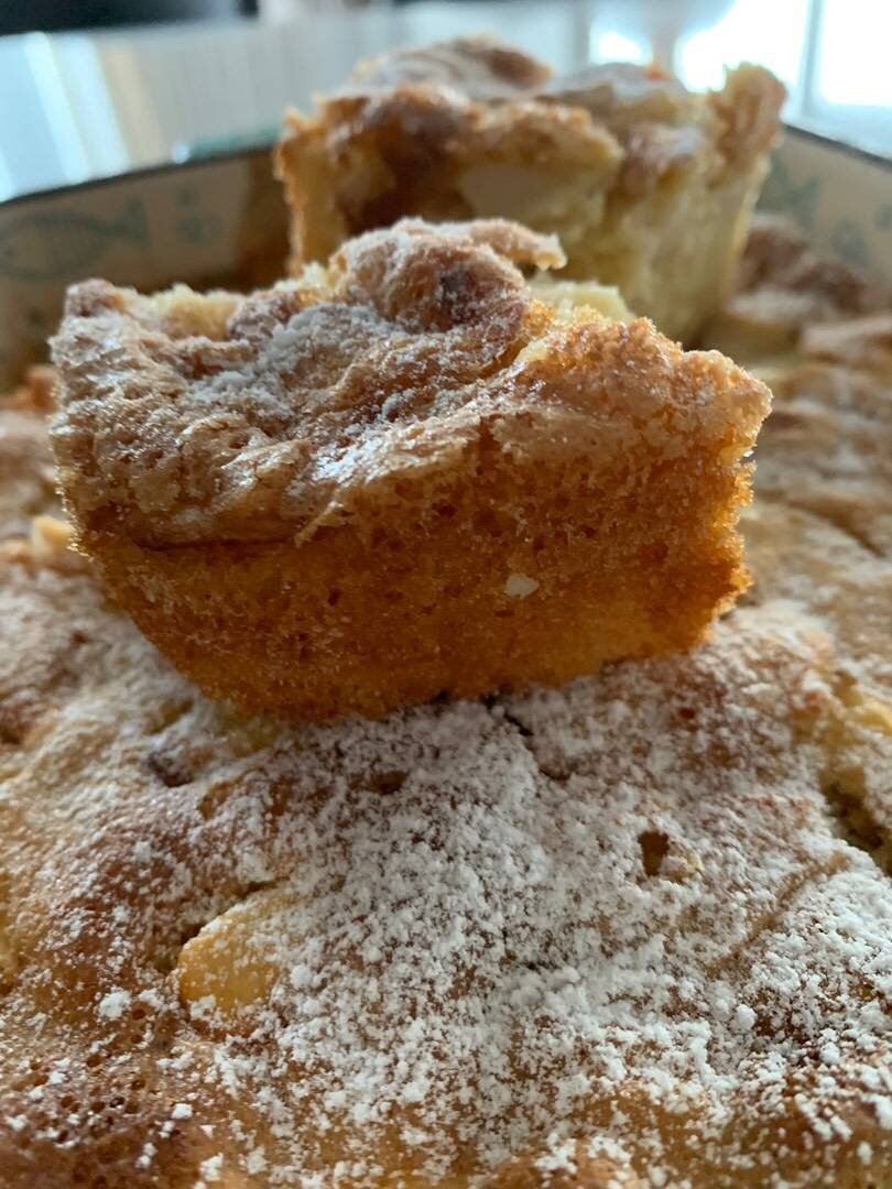 Ингредиенты: яйца, муки, сахара, масла растительного, разрыхлителя, соли, средних яблока Способ приготовления: Готовим тесто: яйца взбиваем с сахаром, солью, добавляем просеянную муку, разрыхлитель, масло растительное. Яблоки чистим, нарезаем дольками. Форму для выпечки смазываем маслом, выливаем часть теста, на него выкладываем нарезанные яблоки и затем выливаем оставшееся тесто. Выпекаем в разогретой духовке до 180 градусов 35-40 минут, готовность проверяем деревянной палочкой. Посыпаем сверху сахарной пудрой. Приятного чаепития!