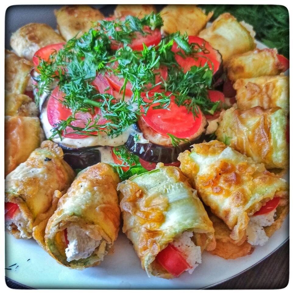 Ингредиенты: кабачки, муки, яйца, творога, сыра, сметаны или майонеза, Зелень, помидора, Соль Способ приготовления: Кабачки режем слайсами тонкими. Я использовала доску для шинковки. Подготовить муку и взбить вилкой 2 яйца. Обмакнуть кабачки сначала в яйце, затем обвалять в муке. И обжарить на сковороде. Выкладывать на бумажное полотенце, чтобы впиталось лишнее масло. Для начинки соединить творог, сметану, соль, зелень, тертый сыр. Можно любимую приправу добавить. Режем дольками помидор. Затем на кабачок кладём по ложечке начинки, помидор и сворачиваем рулетом. Приятного аппетита)