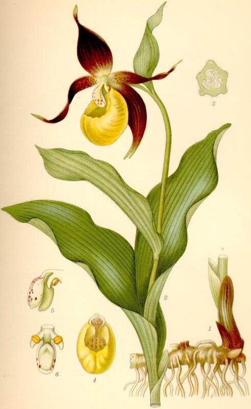 Башмачок или Циприпедиум (Cypripedium) - это род многолетних травянистых растений включающий в себя около 50 видов. У нас в стране наиболее известен «Венерин башмачок настоящий» крупноцветковый (Cypripedium calceolus). Название это цветок получил благодаря шведскому ботанику Карлу Линнею, вдохновленному античным мифом. Родовое название цветка происходит здесь от двух древнегреческих слов – «Kypros» (Киприда, одно из имен Афродиты (в римской традиции Венеры), полученное по имени храма на Кипре, посвященном богине) и «pedale» - башмачок, туфелька. У цветка ярко-желтая, лиловая или фиолетово-розовая губа и темно-пурпурные лепестки. Яркая окраска и эффектная форма орхидеи напоминают крылья бабочек. Существует другая легенда, что когда-то, бабочки сели на растения и не смогли взлететь, превратившись в цветы и подарив им яркую окраску и экзотический облик.