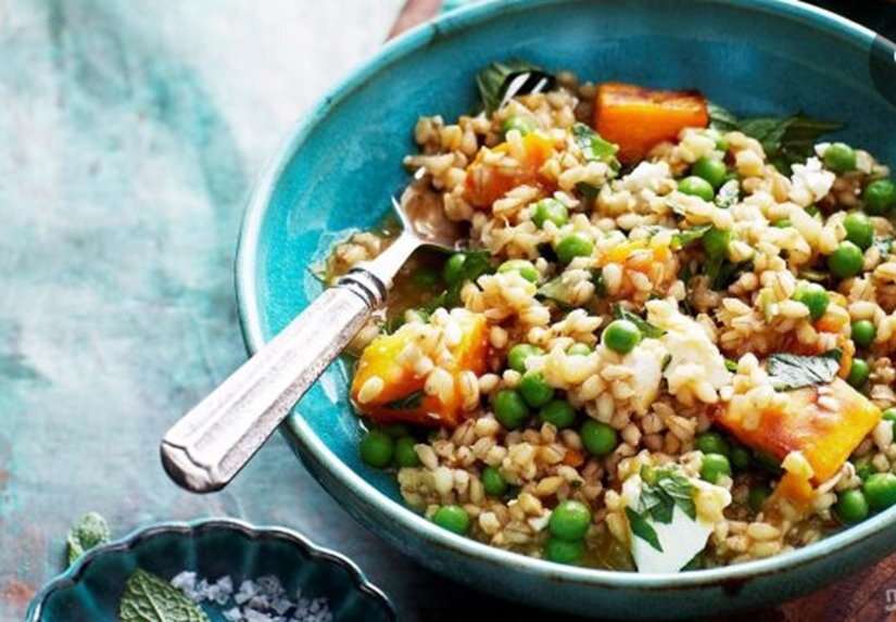 Ингредиенты: • Тыква — 750 Грамм • Перловка — 2 Стакана • Оливковое масло — 50 Миллилитров • Сахар — 1 Ст. ложка • Лук — 1 Штука • Белое вино — 0,5 Стакана • Бульон — 5 Стаканов • Зеленый горошек — 2 Стакана • Фета — 200 Грамм • Мята — 1 Пучок Тыкву вымойте и очистите от кожуры, нарежьте ее кубиками 3х3 сантиметра. Выложите ее в миску и смешайте со столовой ложкой оливкового масла и сахаром. Выпекайте тыкву в разогретом до 200 градусов духовом шкафу около 50 минут. Очистите лук и нарежьте его небольшими кубиками. Разогрейте оставшееся растительное масло в сковороде, добавьте лук. Промойте крупу и добавьте ее спустя 3 минуты после лука в сковороду, влейте вино и добавьте половину испеченной тыквы. Готовьте перловку 30 минут и доливайте понемногу бульон, выложите зеленый горошек, оставшуюся тыкву. Прогрейте несколько минут, добавьте кусочки сыра и измельченную мяту, перемешайте. Подавайте блюдо горячим.