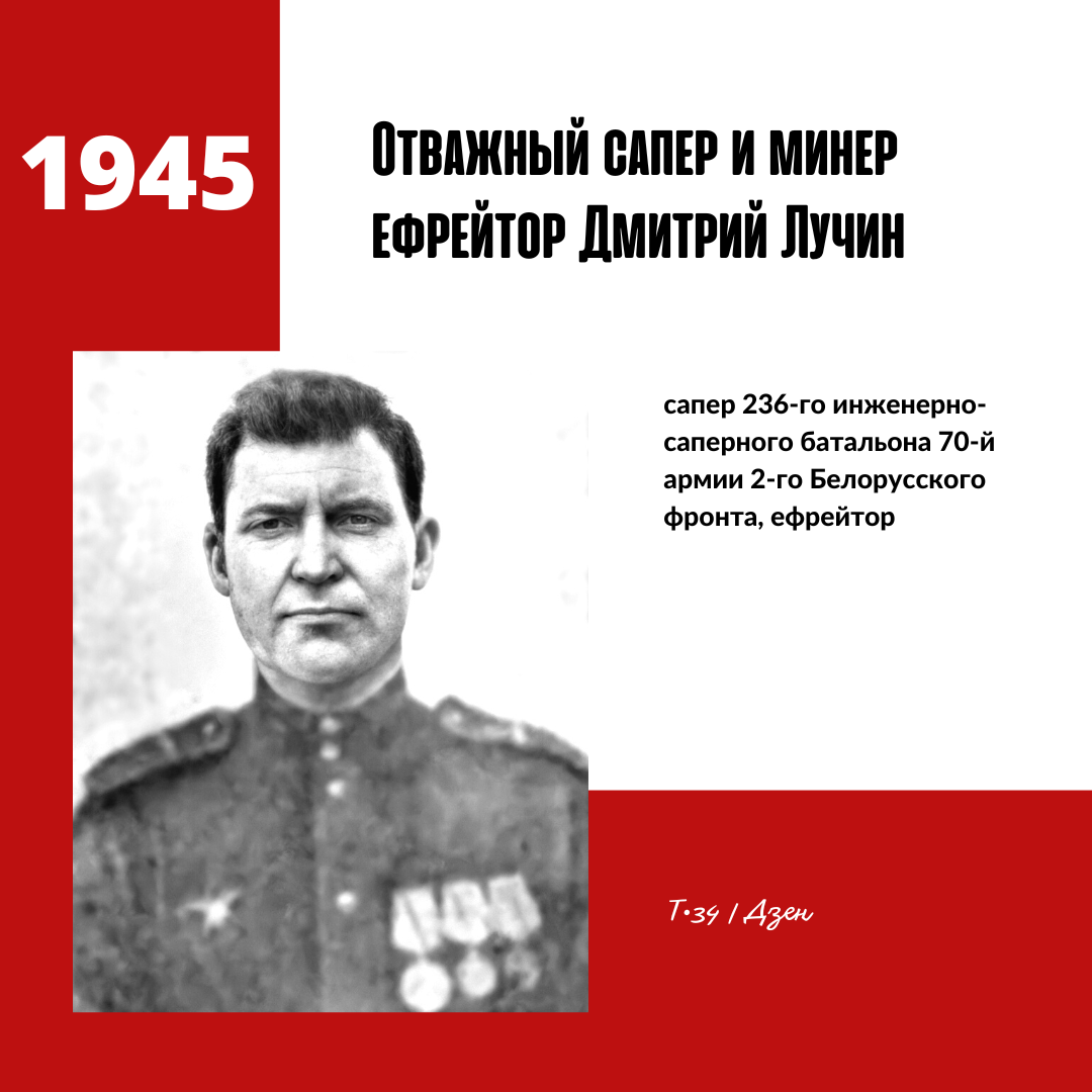 Бывший ефрейтор сапер 236-го инженерно-саперного батальона 70-й армии 2-го Белорусского фронта Лучин Дмитрий Минаевич родился в 1912 году в Сампурском районе Тамбовской области. В Красной Армии с 23 июня 1941 года. Участник Великой Отечественной войны с 25 марта 1944 года. Для него нет преград. Какие бы ни были препятствия, Дмитрий Лучин всегда их преодолевает. СЛАВА СМЕЛОМУ И НАХОДЧИВОМУ САПЕРУ! ЕФРЕЙТОР Дмитрий Минаевич ЛУЧИН — ветеран части. В одной и той же роте он служит с первых дней Отечественной войны. С тех пор бывалый воин прошел славный боевой путь. В трудные осенние дни 1941 г. Дмитрий ЛУЧИН минировал подступы к нашей столице — МОСКВЕ. В 1942 г. он обезвреживал вражеские мины на северном участке фронта, а в 1943 г. сооружал мосты через Сожь и Днепр, прокладывал путь нашим воинам на земле врага — в Померании. Недавно командир дал Дмитрию ЛУЧИНУ задание: скрытно пробраться в тыл к немцам и заминировать одну важную дорогу. Отважный сапер Дмитрий ЛУЧИН, пробираясь в тыл врага,