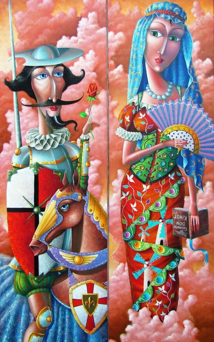 Я в любви признавался, краснея. Я смущался от ваших красот. Дорогая моя, Дульсинея, Я сражённый тобой Дон Кихот. Дама сердца. Сама добродетель. Была послана мне в трудный час. Мне твой голос донёс летний ветер. Мчал на зов я, доспехом бренча. Воин славный влюбился в фемину. Смелый рыцарь оставил талант. Моё сердце теперь не покинут Дульсинея и конь Росинант. Спросишь ты - а зачем о коне я? Без него мы б не встретились вдруг. Дорогая моя, Дульсинея, Мой любимый и ласковый друг. Пусть другие у мельниц сразятся. Пусть другие за доблесть в бою Своим ликом в щите отразятся. Я богине сегодня пою. Нынче я всех героев сильнее. Моя робость теперь позади. Дорогая моя, Дульсинея, Своим чувством меня награди.