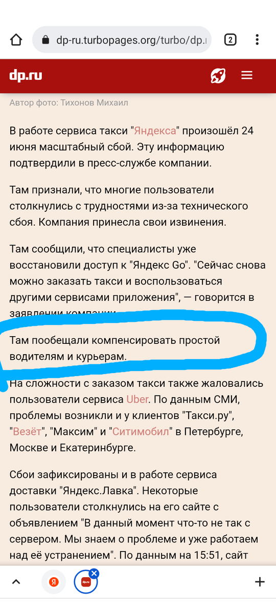Здравия, товарищи!🦤 Сегодня на моём канале я расскажу вам о глобальном техническом сбое Яндекс Про в пятницу 24 июня. В районе 10:00-11:00 часов перестали приходить заказы, не прогружались и другие ресурсы Яндекса. Яндекс подтвердил сбой на своих ресурсах, а также запостил мессендж, что "восполнит водителям простой" (смешно)🤭🙈 Первые заказы начали приходить к 13:30-14:00 того же дня. В 14:00 я решил сделать заказ, находясь в зоне повышенного спроса, но заказ пришел без коэффициента ⚡(стоило об этом задуматься, но заказ все же взял). Самое интересное, что расчет на подачу был неадекватен: алгоритм приложения Яндекс Про решил, что расстояние в 3 км (от моего местоположения до точки А) я успею проехать за 2 минуты. При этом Яндекс Навигатор подсчитал время 12 мин, что более реально. Доехав до клиента, выяснилось, что в приложении исчез его номер телефона.🙄 Пришлось писать в поддержку. Они сообщили что клиент в курсе, что курьер подъехал и сейчас выйдет. Прождав приблизительно 20 м