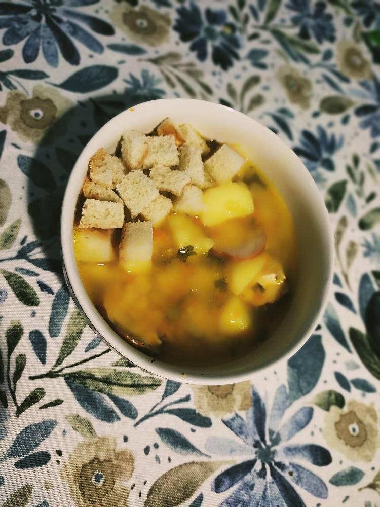 На вигляд -дуже просто, а на смак, копченість курятини дає йому неймовірний смак. #лайфхаки Ингредиенты: гороху, крила курки для бульйону, Копчене куряче філе, великих картоплин, велика морква, велика цибуля, Італійські трави (спеція), Хліб на грінки, Сухий часник, Зелень, вода Способ приготовления: Гарно промийте горох та разом з крилами відправте проваритись. Нехай покипить 20 хв. Злийте воду. Промийте інгредієнти і кастрюлю, наберіть чисту воду, додайте лавровий лист, картоплю і відправте варитись новий бульйон на 1 годину. #лайфхак Така маніпуляція позбавить вас від нескінченної пінки. Її стане в рази менше. Тим часом зробіть зажарку. Та наріжте копчене філе слайсами. Хліб на грінки поріжте кубиками, посипте сіллю, сухим часником і збризніть каплею сонячної олії та прижарте 20 хв в духовці на 180 градусів Через годину додайте в бульйон зажарку та копчене філе, нехай ще покипить 30 хв. Крила дістаньте, та розберіть м'ясо від кістки. М'ясо поверніть до кастрюлі. По завершенні додайте