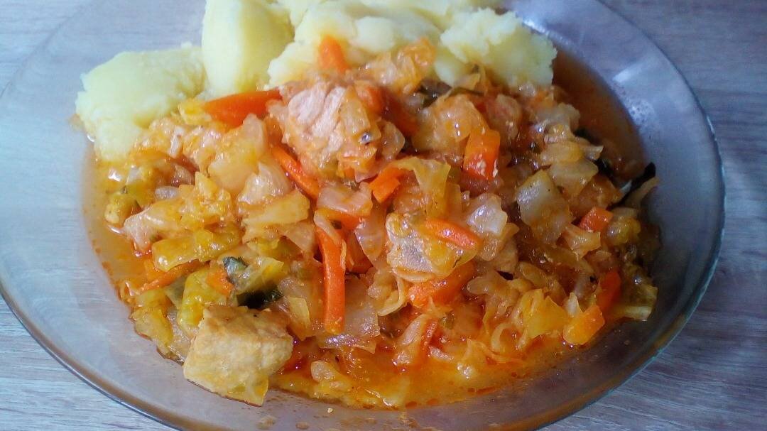 #вторыеблюда Ингредиенты: Мясо, Капуста, моркови, большая луковица, Томатная паста , Соль и сахар , "Букет перцев", петрушки, Масло подсолнечное Способ приготовления: Морковь и лук режем соломкой и обжариваем до полуготовности с добавлением подсолнечного масла. Мясо режем на произвольные кусочки, добавляем к овощами, слегка обжариваем в течение нескольких минут. Добавляем томатную пасту, соль, сахар, перец и немножко воды. Тушим до мягкости мяса. Отдельно с добавлением небольшого количества масла и соли обжариваем нашинкованную капусту. Так как капуста молодая, она очень быстро готовится и уже за 5-7 минут она становится мягкой. Соединяем уже мягкую капусту и мясо в томате, перемешиваем, добавляем мелко рубленую петрушку, накрываем крышкой и тушим ещё минут 7-10. Готово!Приятного аппетита. Хорошо сочетается с картофельным пюре 1:1.