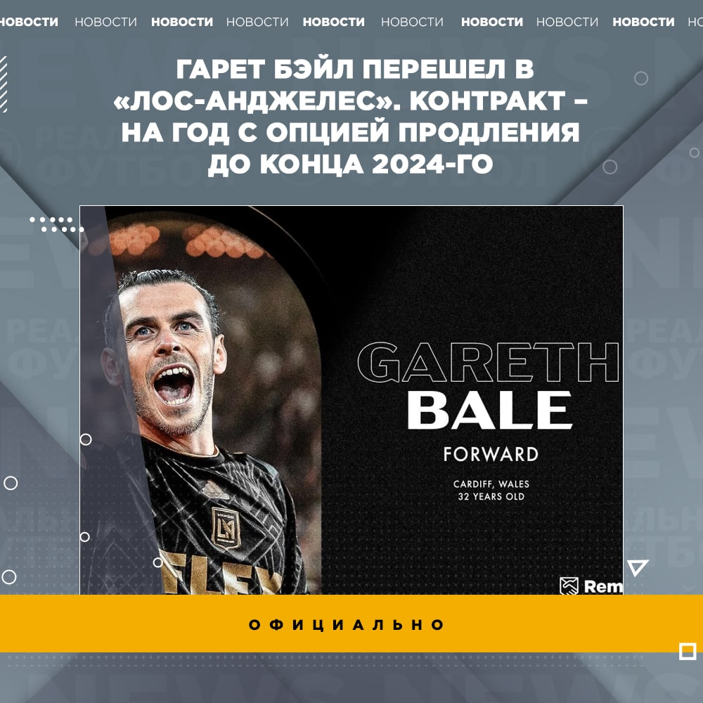 Валлийский нападающий Гарет Бэйл перешёл в «Лос-Анджелес», сообщает пресс-служба клуба МЛС. Соглашение форварда с клубом рассчитано на один год с возможностью продления ещё на сезон.