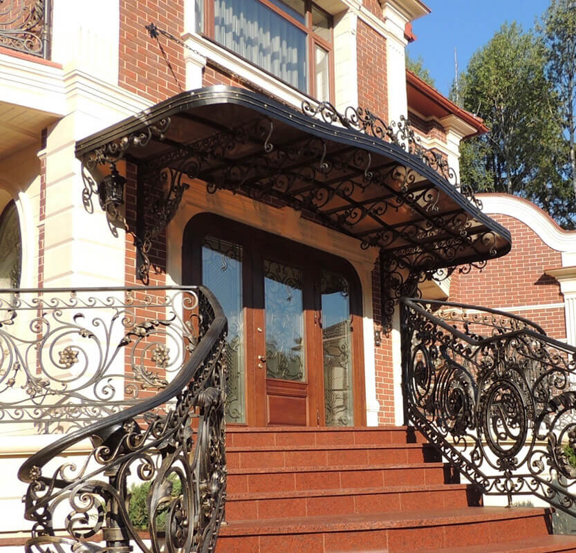 Козырек над входной дверью - элемент необходимый для комфорта хозяев. Его включают практически во все проекты домов, так как без козырька у владельцев может возникнуть множество проблем. Зачем нужны козырьки над дверью? Они выполняют не только декоративную функцию, хотя козырек логично завершает вид входной группы и традиционно ее украшает. В чем плюсы кованых козырьков Кованые козырьки все чаще встречаются в современных проектах. Почему владельцы выбирают именно ковку? Загляните в каталог “Ковка Дизайн”, чтобы на реальном примере оценить достоинства кованых козырьков. Среди готовых моделей в портфолио есть небольшие навесы для крыльца, искусно украшенные арочные конструкции, целые ансамбли для оформления входа в здание. Многие заказывают козырьки как часть полноценной входной группы, которая включает перилы, колонны, светильники, ступени и другие элементы в том же стиле.